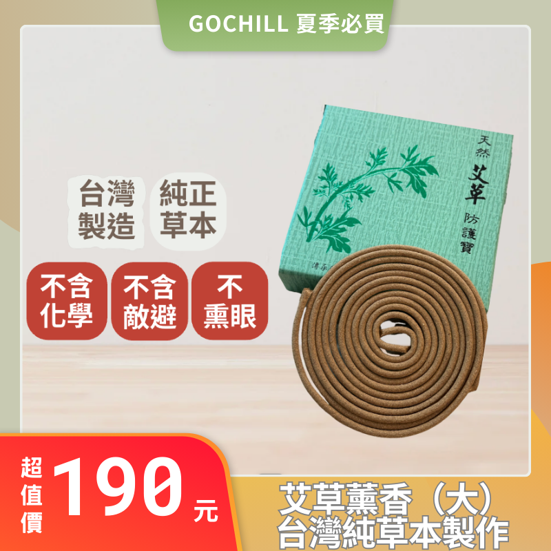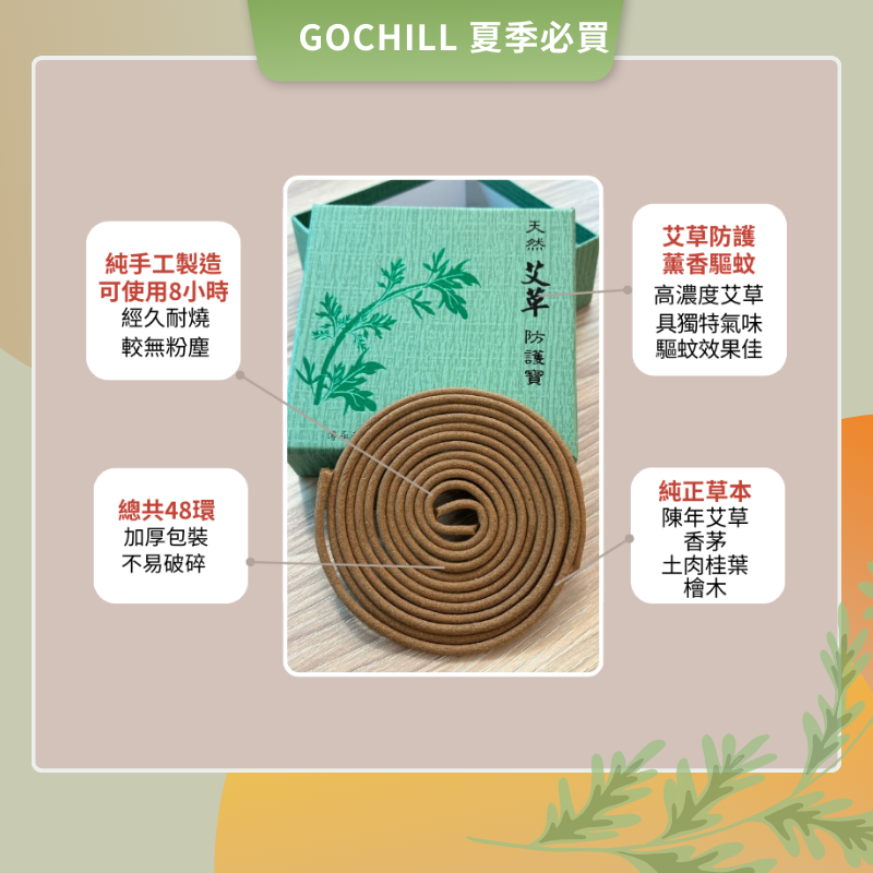 【商品介紹】 ・純草本成分無添加染色劑、香料 ・不刺鼻不熏眼 ・室內戶外都適用 【商品規格】 ・尺寸:20環 ・直徑:約11cm ・成分:陳年艾草粉、香茅、土肉桂葉、檜木 ・燃燒時長:7-8小時/環 ・包裝:上下開式厚紙盒